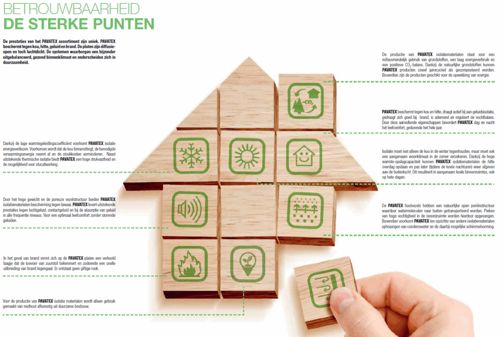 De basis van het renovatieproject is een houtskeletbouwsysteem voor de wanden en het dak, gebaseerd op de houtvezelisolatie van Pavatex. Deze houtvezelisolatie wordt toegepast in zowel alle buitenwanden, alsook in alle dakelementen. Het is een natuurlijk materiaal dat niet alleen in de winter beschermt tegen kou, maar in de zomer ook tegen hitte. Doordat het materiaal vocht opneemt, damp-open is en geluidsisolerend werkt, staat het gebruik van houtvezelisolatie garant voor een optimaal comfort; het gehele jaar door.