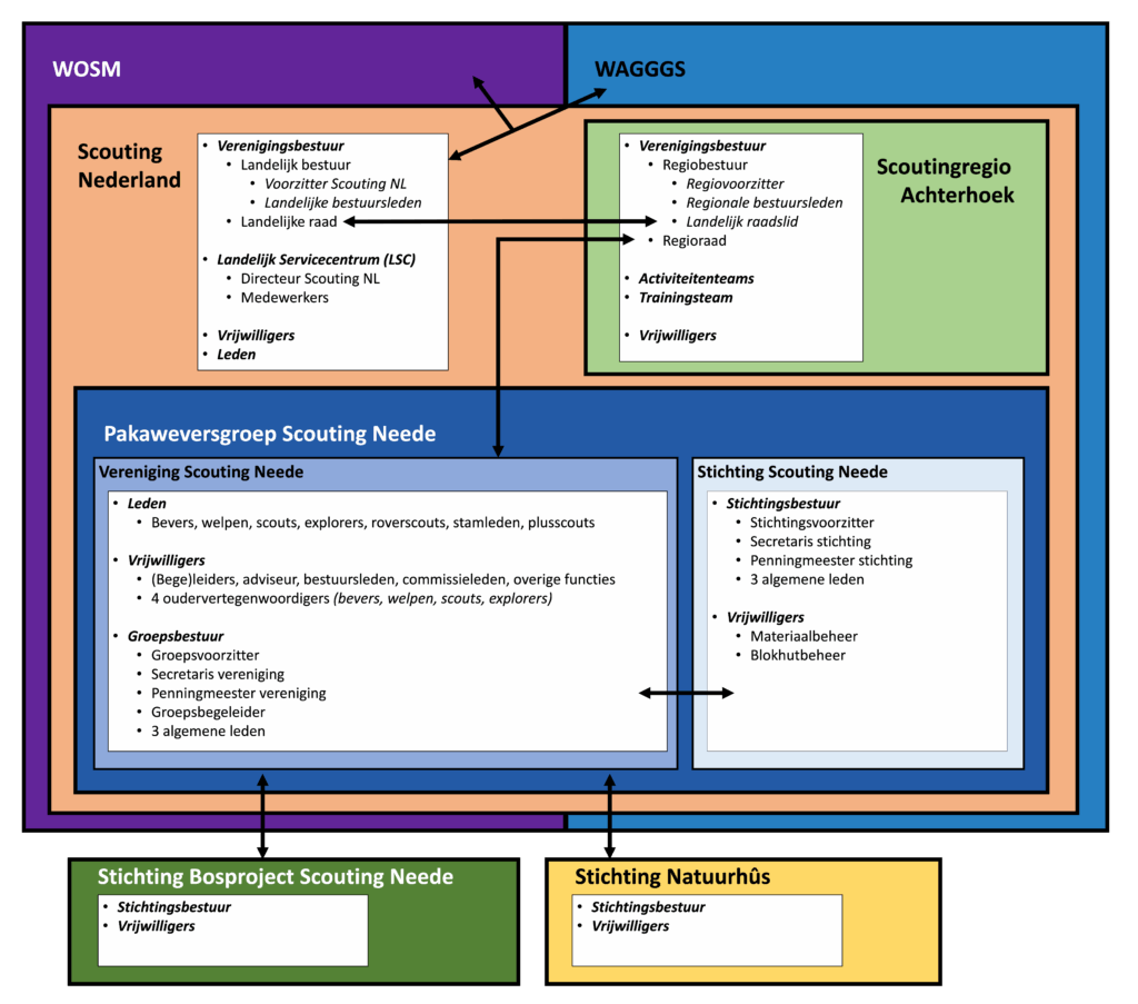 Scouting Nederland is ten slotte weer onderdeel van de twee wereldwijde Scoutingorganisaties: WOSM (World Organization of the Scout Movement) en WAGGGS (World Association of Girl Guides and Girl Scouts). Tegenwoordig werken beide organisaties veel samen. Scouting Nederland is vanuit ons land de vertegenwoordiger in beide organisaties.